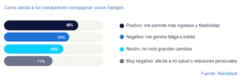 El pluriempleo en España genera opiniones encontradas. Casi la mitad de los encuestados (46%) lo valora positivamente, al verlo como una vía para obtener ingresos extra y algo de flexibilidad. Pero el coste personal es evidente: un 23,5% asegura que les provoca fatiga o estrés y un 11% lo considera muy negativo, por el impacto en su salud y relaciones personales. Entre ambos extremos, un 19% afirma no notar grandes cambios, reflejo de cómo, en algunos sectores, compatibilizar empleos se ha convertido en una práctica normalizada.
