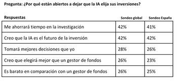 El estudio, que encuestó a 11.000 inversores minoristas en 13 países -1.000 de ellos en España- revela que el 19% utiliza ahora herramientas de IA para seleccionar o modificar inversiones, frente al 13% del año anterior. La proporción de inversores en todo el mundo abiertos a adoptar estas tecnologías se mantiene estable en el 39%, en comparación con el 38% del año pasado. La encuesta española registra un porcentaje similar entre quienes usan la IA (19%), aunque las respuestas de los que dicen estar dispuestos a emplear esta tecnología se elevan hasta el 45%.