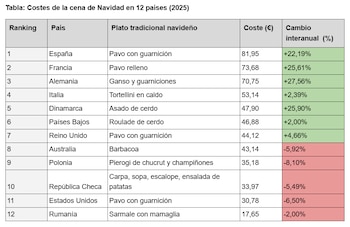 En cuanto a los hogares alemanes, experimentan el aumento más pronunciado, con el precio aumentando un 28% interanual hasta 70,75 euros, lo que coloca a Alemania entre los tres países más caros para la cena de Navidad.