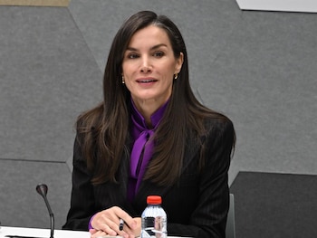 Al tratarse de un acto estrictamente laboral y de oficina, la reina ha apostado por el que ya es un clásico y que muchos definen como su uniforme de trabajo: un traje de chaqueta. Si bien ha lucido esta fórmula en incontables ocasiones, en esta ocasión ha introducido un sutil guiño al llenar de color el look. Para ello ha rescatado de su armario una blusa morada que estrenó en 2009, cuando todavía era princesa. Está firmada por Felipe Varela y destaca por su lazada en la zona del cuello y sus mangas ajustadas.