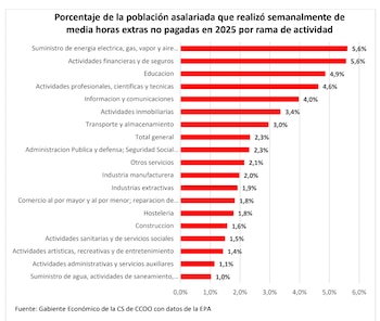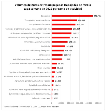 Más allá de las horas extraordinarias declaradas, el sindicato alerta de otra cifra significativa: 928.000 asalariados trabajan habitualmente más horas de las pactadas sin que conste su remuneración.