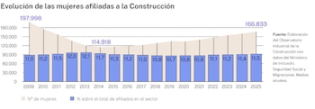 El empleo femenino en el sector de la construcción en España alcanzó en 2025 su nivel más alto en once años, con 166.833 mujeres afiliadas a la Seguridad Social, lo que representa el 11,5% del total de personas ocupadas en el sector y un crecimiento del 4,1 % respecto al año anterior. Este avance supera el ritmo de crecimiento de la afiliación masculina, que se situó en el 3% el año pasado.