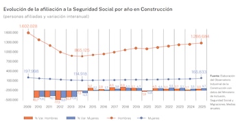 La presencia femenina en el sector de la construcción no solo mostró un avance superior al de los hombres, sino que registró el mayor incremento de afiliación en comparación con el conjunto de sectores productivos. Este comportamiento ha devuelto al sector a cifras que no se alcanzaban desde 2014, cuando el porcentaje de mujeres sobre el total llegó al 11,7%, según recoge el Observatorio Industrial de la Construcción, elaborado por la Fundación Laboral de la Construcción (FLC),