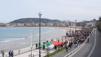 Miles de personas se secundado este domingo, desde el Alderdi Eder hasta el Peine del Viento en San Sebastián, la manifestación convocada por agentes de la cultura vasca en apoyo al pueblo palestino bajo el lema 'Genocidio Stop'. Durante la movilización ha habido una decena de actuaciones artísticas, desde bertsos, hasta música o creación de una ilustración. La marcha, convocada por la iniciativa Kulturatik Creadorxs Culturales con Palestina, ha partido hacia la una menos veinte de los jardines del Alderdi Eder encabezada por una gran bandera palestina, portada, entre otros, ciudadanos palestinos, seguida de una pancarta con el lema 'Genozidioa Stop' que portaban personalidades de la cultura vasca como los actores Gorka Otxoa, Joseba Apaolaza, Jon Olivares, Josean Bengoetxea, Itziar Atienza, Mireia Gabilondo, Aitziber Garmendia o el músico Fermín Muguruza, entre otros. También han acudido delegaciones del PSE-EE con Denis Itxaso, Ane Oyarbide y Susana García Chueca, entre otros; de Elkarrekin Podemos con Jone Belarra, Juantxo López de Uralde, Víctor Lasa y Miren Echeveste, entre otros; y Nerea Kortajarena de EH Bildu; así como de otras entidades como la ONG Salvamento Marítimo Humanitario. También se han adherido los sindicatos Steilas, UGT, LAB, CCOO, ELA y Etxalde y colectivos como Gernika Palestina Herri Ekimena, la plataforma YALA Nafarroa y Sanitarioak Palestinarekin. A continuación, varias personas portaban cada una letras que formaban las palabras 'SOS Gaza'. Miles de ciudadanos se han ido sumando a la movilización con banderas de Palestina y pancartas en apoyo al pueblo palestino. A la altura de la sede del Gobierno Vasco en la calle Andía dos personas se han subido a la fachada del edificio y han colocado bengalas de humo negro y dos pancartas en las que se podía leer '¡Universidad del País Vasco (UPV/EHU), Spri, Ertzaintza y Gobierno Vasco, cómplice!' en euskara, mientras abajo se coreaban lemas como 'Boicot a Israel' o 'Liberad a Palestina!, en euskara. En los diez puntos con actuaciones artísticas establecidos durante la movilización han actuado músicos y cantantes como Olatz Salvador, El Drogas, Maddi Oihenart y Juantxo Zeberio, Mikel Urdangarin, Sara Zozaya, Petti, Et Incarnatus kamara orkestra, Maider Zabalegi y Bixente Martinez. También los bertsolaris Amets Arzallus, Maialen Lujanbio, Beñat Gaztelumendi, Sarai Robles, Nerea Elustondo, Jon Maia; los ilustradores Malmö y Maitane Azurmendi; las bailarinas Noe Viana, Leire Otamendi, Ainhoa Usandizaga y Jone Amezaga; y las corales Kantuz de Hernani, Salatxo de Orio, Kantakidetza de San Sebastián y Aiztondo de Astigarraga con Javier Perez de Azpeitia. Además, se han realizado 23 murales a partir del lema de la convocatoria, que posteriormente configurarán una muestra itinerante que visitará numerosas ciudades y municipios. Al final de la marcha, desde el túnel de Ondarreta hasta el Peine del Viento los participantes se han tumbado en el suelo y han compuesto con sus cuerpos una gran figura humana simbolizando los asesinados en Gaza. MANIFIESTO En el Peine del Viento, las actrices Mireia Gabilondo e Itziar Atienza han procedido a la lectura de un manifiesto en euskara y castellano, en nombre de los convocantes, a través del cual han pedido "no acostumbrarse, no olvidar" ante esta "pérdida de humanidad y la normalización del terror" por parte de un estado de Israel "racista y criminal" que "mata cada día a cientos de personas inocentes". Además, han criticado "la tibieza cómplice del mundo libre y civilizado, presidido por Estados Unidos y seguido por la Unión Europea". "Estamos ante un genocidio, un apartheid sistemático", han insistido y ante ello han reclamado a los dirigentes políticos e instituciones que "cesen todas sus relaciones comerciales, militares y diplomáticas con Israel". Finalmente, ante esta "masacre", han pedido a la Unión Europea que tome "medidas contundentes para obligar al agresor a poner fin a su brutal embestida" con una "tregua definitiva, fin de la ocupación, y cese de la violencia contra hombres y mujeres y niños inocentes".