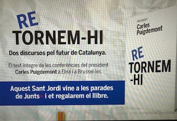 El candidato de Junts+ a las elecciones al Parlament, Carles Puigdemont, ha recopilado sus dos últimas conferencias en un libro que el partido regalará por Sant Jordi. Bajo el título de 'Retornem-hi. Dos discursos pel futur de Catalunya', se trata de las dos conferencias íntegras que Puigdemont pronunció en Elna (Francia) y Bruselas. Está previsto que el 23 de abril, día de Sant Jordi, el partido regale el libro a todas las personas que se acerquen a las paradas que tendrán en toda Cataluña, y que Puigdemont lo presente telemáticamente, a partir de las 17h, en el estand de la formación en Barcelona.