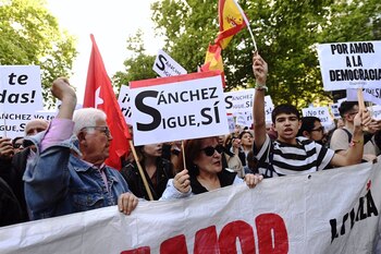 Miles de personas se han manifestado bajo el lema 'Por amor a la democracia' en un recorrido que ha partido desde Atocha y que ha llegado hasta el Congreso de los Diputados horas antes de que el presidente del Gobierno, Pedro Sánchez, comparezca ante los medios para comunicar su decisión sobre su continuidad al frente del Ejecutivo tras cinco días de reflexión. A la manifestación, que ha llamado a la movilización de la ciudadanía este domingo a las 19.00 horas para "defender la democracia frente a las falsedades de la derecha mediática", han acudido además la ministra de Sanidad, Mónica García, el ministro de Cultura, Ernest Urtasun, el portavoz de Sumar en el Congreso, Íñigo Errejón o la candidata de Sumar a las elecciones europeas, Estrella Galán, entre otros. Durante el recorrido, que ha durado alrededor de una hora y que ha partido desde Atocha en dirección al Congreso de los Diputados, se han podido escuchar diversos cánticos en apoyo a Pedro Sánchez pidiéndole que no dimita y que no se rinda. Además han mostrado su respaldo a la mujer de Sánchez, Begoña Gómez, coreando "Begoña, estamos contigo". Asimismo han resonado lemas como "no pasarán" o "hay que parar la mafia judicial". A la llegada al Congreso se ha escuchado también el himno del PSOE en apoyo al presidente, que mañana comunicará su decisión sobre si sigue o no al frente del Gobierno.