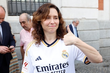 Isabel Díaz Ayuso dijo unas palabras tras recibir una réplica del trofeo de Liga, además de una camiseta con sus apellidos “Díaz Ayuso” y el número uno a la espalda que la presidenta no dudó en ponerse, y otra con la palabra “Campeones” y el número 36.