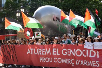Unas 2.600 personas, según la Guardia Urbana de Barcelona, se han manifestado este sábado por la tarde en el centro de la ciudad a favor de Palestina y contra Israel, simultáneamente a otras ciudades europeas, mientras que la organización ha asegurado que son 10.000 asistentes. Desde las 17 horas aproximadamente, han recorrido todo el paseo de Gràcia, desde la avenida Diagonal hasta la plaza Cataluña, y durante el recorrido han simbolizado las víctimas de la guerra en Gaza tumbándose en masa a lo largo del Paseo. Mientras desplegaban en horizontal una gran bandera palestina, han coreado 'Desde el río hasta el mar Palestina vencerá'. La pancarta de la cabecera mostraba la leyenda 'Paremos el genocidio en Palestina. Basta de comercio de armas con Israel'. Entre los asistentes han estado el candidato de Comuns Sumar a las elecciones europeas, Jaume Asens, y la dirigente de la CUP Laure Vega. Mientras, sigue la acampada pro Palestina dentro de la sede central de la Universitat de Barcelona, en la plaza Universitat, muy cercana a la plaza Cataluña.