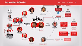 El PP ha lanzado este jueves una página web en la que recopila lo que llama "las mentiras de Sánchez" y donde sitúa al presidente del Gobierno y a su esposa, Begoña Gómez, en el centro de lo que llama "la trama". La web ha sido presentada en la red social X por el portavoz del Grupo Popular, Miguel Tellado, quien asegura que "el presidente está asediado por la corrupción, su debilidad parlamentaria es total y cada día está más extorsionado por sus socios de investidura". "Sánchez ha dado sobradas muestras de no tener límites y ha hecho de la mentira su forma de sobrevivir", afirma en el vídeo de presentación. Según explica, el Gobierno necesita "el olvido" de los ciudadanos para mantenerse pues "la memoria más reciente es el mayor enemigo de un Pedro Sánchez que vive asediado por sus propias mentiras", y eso es lo que justifica, según dice, el lanzamiento de este contenedor de noticias de distintos medios. "Esta página web que nace con la vocación de ser el disco duro de las principales mentiras y falsedades de Pedro Sánchez, el rey del bulo --asegura--. La web es un espacio que recopila decenas y decenas de bulos, de falsedades y de mentiras que han marcado la existencia del propio Sanchismo. Sus grandes éxitos, desde el nunca pactaré con Podemos, al nunca me entenderé con Bildu, pasando por la amnistía, es inconstitucional. Todo aquello que Sánchez quiere que olvides". En la página principal, un organigrama con lo que el PP llama "la trama" que reúne a protagonistas del caso Koldo y las actividades profesionales de Begoña Gómez, y en cuyo centro se sitúan el presidente y su esposa.