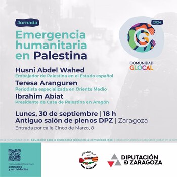 El embajador de Palestina en España, Husni Abdel Wahed, analiza este lunes en la Diputación de Zaragoza la emergencia humanitaria en Gaza. La jornada contará con la presencia, además, de la periodista especializada en Oriente Medio Teresa Aranguren, y el presidente de la Casa Palestina de Aragón, Ibrahim Abiat, analizan este lunes en la DPZ la emergencia humanitaria en Gaza. La nueva edición del programa Comunidad Glocal arranca con su primer eje temático que aborda la situación de los derechos humanos en Palestina. La primera de las tres jornadas de Glocal tendrá lugar este lunes 30 de septiembre a las 18.00 horas en el antiguo salón de plenos de la Diputación de Zaragoza. La entrada será libre hasta completar aforo. Es la quinta edición del programa Comunidad Glocal que impulsa la Delegación de Solidaridad y Cooperación al Desarrollo de la DPZ. El objetivo de Glocal es promover la educación para la ciudadanía global y sensibilizar sobre las realidades de los pueblos más desfavorecidos. Esta primera jornada será una oportunidad única de encuentro y formación para todas las personas que quieran profundizar en la situación de emergencia que vive en estos momentos el pueblo palestino. Aranguren cuenta con una amplia carrera ligada al periodismo en zonas de conflicto, en la que ha cubierto la invasión israelí de Líbano de 1982, la guerra Irán-Irak y las sucesivas crisis del Golfo, el conflicto palestino-israelí y las guerras de los Balcanes, además de haber recibido diversos premios por su actividad profesional. La periodista entrará en conversación con Husni Abdel Wahed e Ibrahim Abiat, en torno al genocidio que está sufriendo el pueblo palestino y la emergencia humanitaria que se vive en la zona de conflicto mientras la sociedad civil exige que se rompan las relaciones comerciales con Israel en un debate abierto al público.