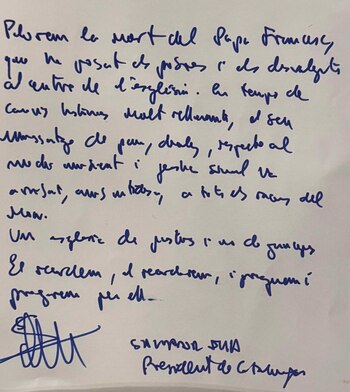 "Lloramos la muerte del papa Francisco, que puso a los pobres y desvalidos en el centro de la iglesia, en tiempos de cambios históricos muy relevantes. Su mensaje de paz, diálogo, respeto al medio ambiente y justicia social ha llegado con nitidez a todos los rincones del mundo", ha escrito el presidente catalán, según han informado el Govern este martes.