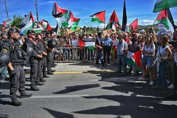 Ione Belarra e Irene Montero, junto a otros integrantes del Consejo Ciudadano Estatal y militantes de Podemos, han participado esta tarde en las protestas contra el genocidio de Israel en Palestina a la altura de Cercedilla (Madrid), donde La Vuelta ha tenido que ser desviada.