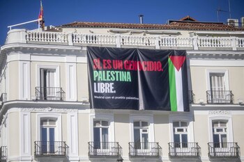 Más Madrid ha desplegado en la fachada de uno de los edificios de la Puerta del Sol una lona en la que se lee 'Sí, es un genocidio. Palestina libre. Madrid con el pueblo palestino".