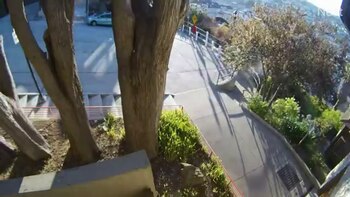 Las imágenes registradas por otra cámara, situada en la parte inferior del terraplén, captó cómo el coche chocó contra un árbol y aterrizó sobre su techo en las calles 19 y Sánchez de la ciudad californiana.