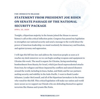 En opinión del presidente la necesidad de esta ayuda militar era "urgente", ya que Ucrania se enfrenta "al bombardeo sin descanso de Rusia"; también para Israel, que ha experimentado "ataques sin precedentes de Irán" y para el Indo-Pacífico.