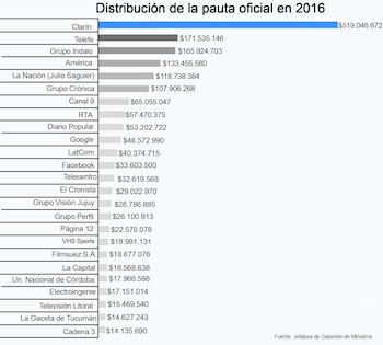 Más atrás ingresan América, que recibió $133.455.580, el diario La Nación (Julio Saguier), con $118.738 -en 2015 había obtenido $23,7 millones-, y el Grupo Crónica, que percibió en materia de publicidad oficial $107.906.268.