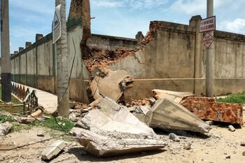 El torreón del ejército del Perú que está en la ciudad de Tumbes, evidenció la magnitud del movimiento telúrico en Tumbes al caerse, bloqueando parte de la acera.