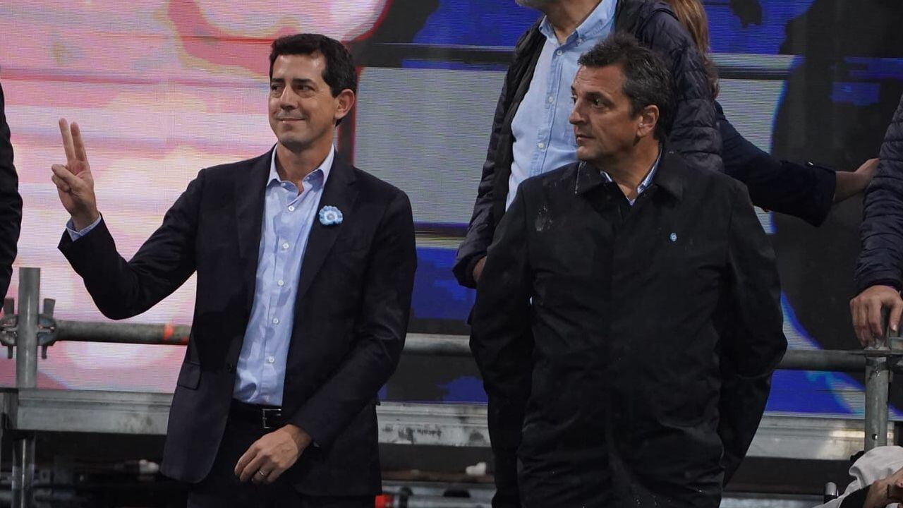 Eduardo "Wado" de Pedro, ministro del Interior de la Nación, junto a Sergio Massa, ministro de Economía de la Nación. Ambos, en el escenario montado frente a la Casa Rosada