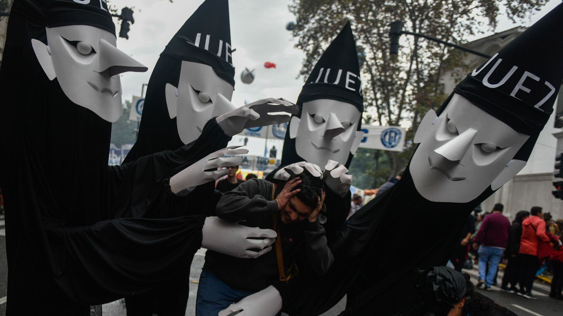 Los cuatro muñecos con túnicas negras que representan a los cuatro jueces de la Corte Suprema se hicieron presentes en la Plaza de Mayo