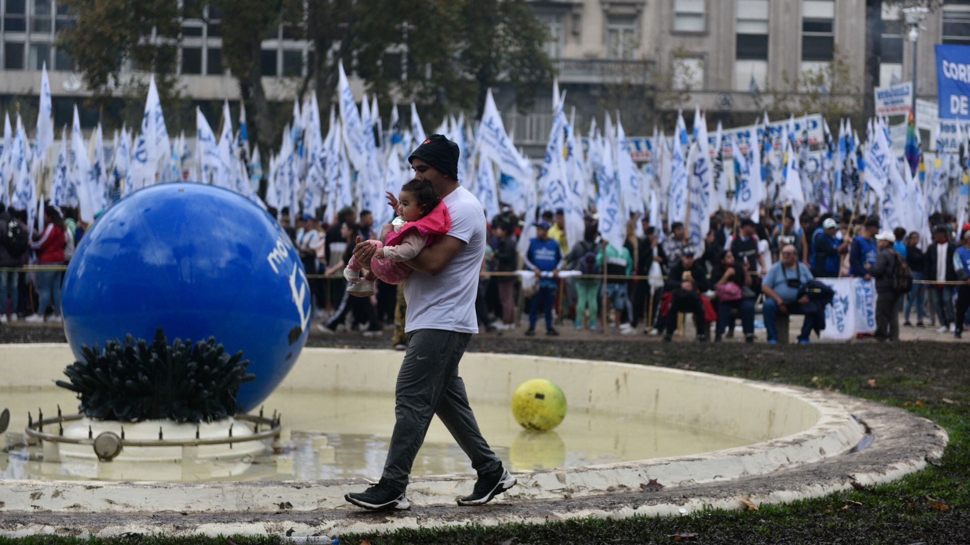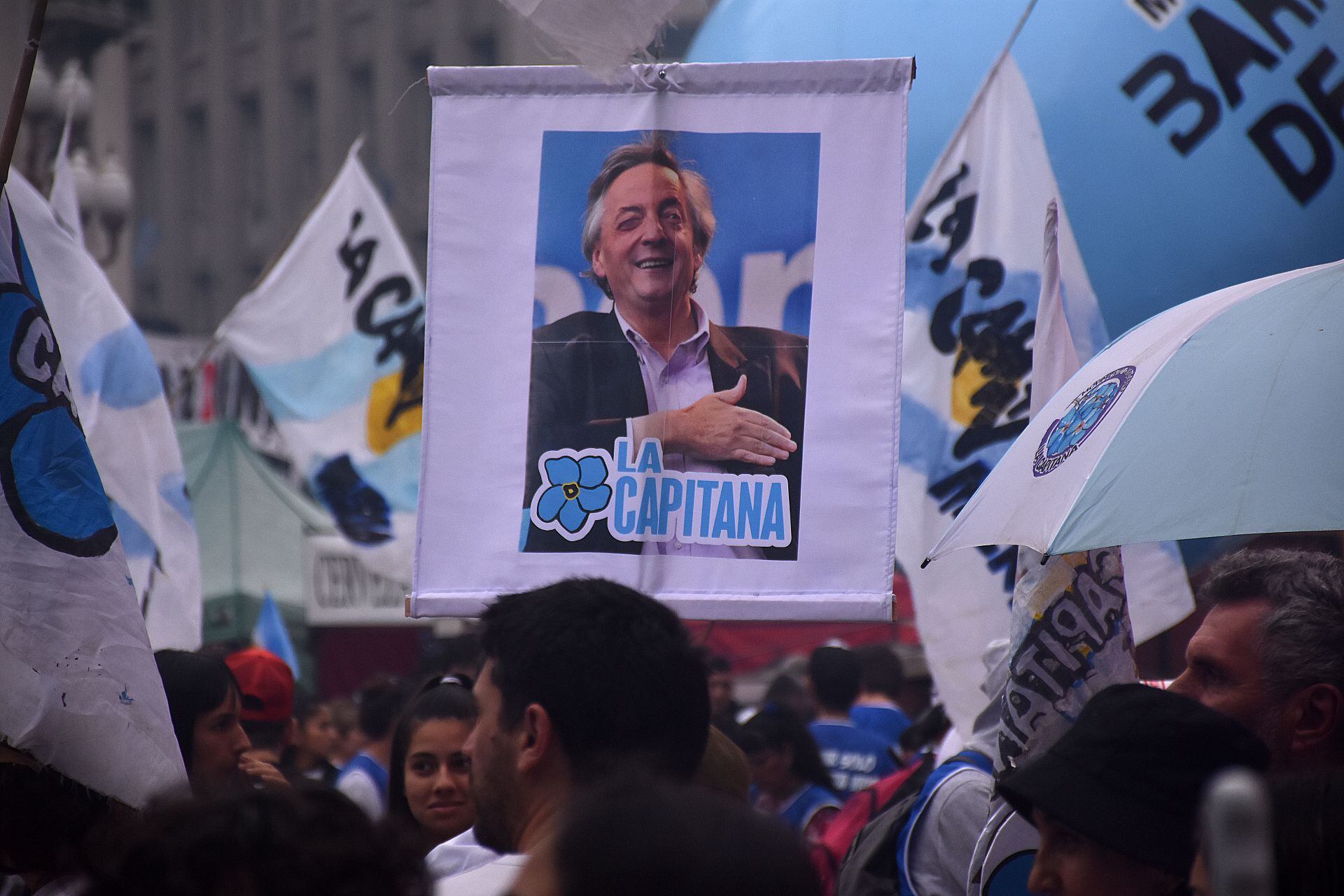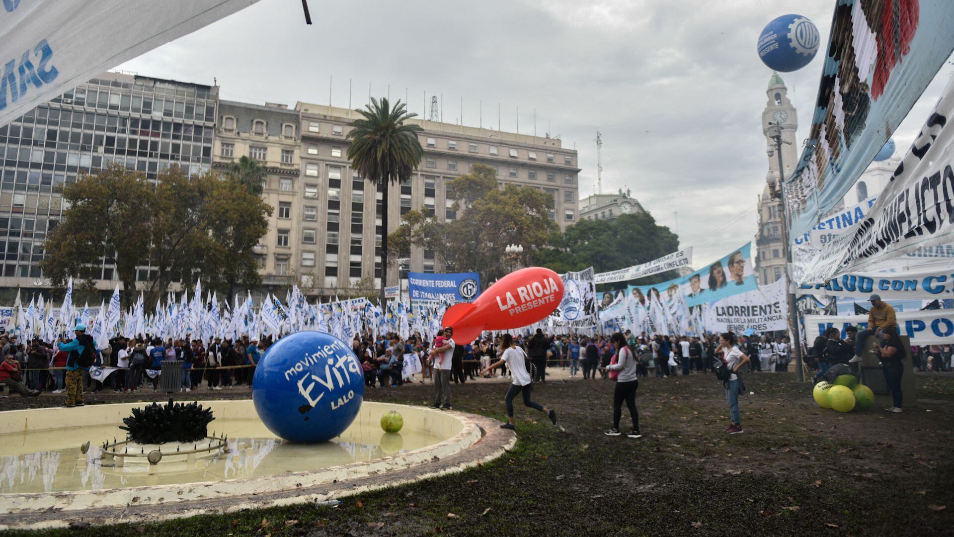 Las columnas de la militancia mientras circulaban hacia la Plaza. Los paraguas se destacaron entre las postales que entregó la previa del acto