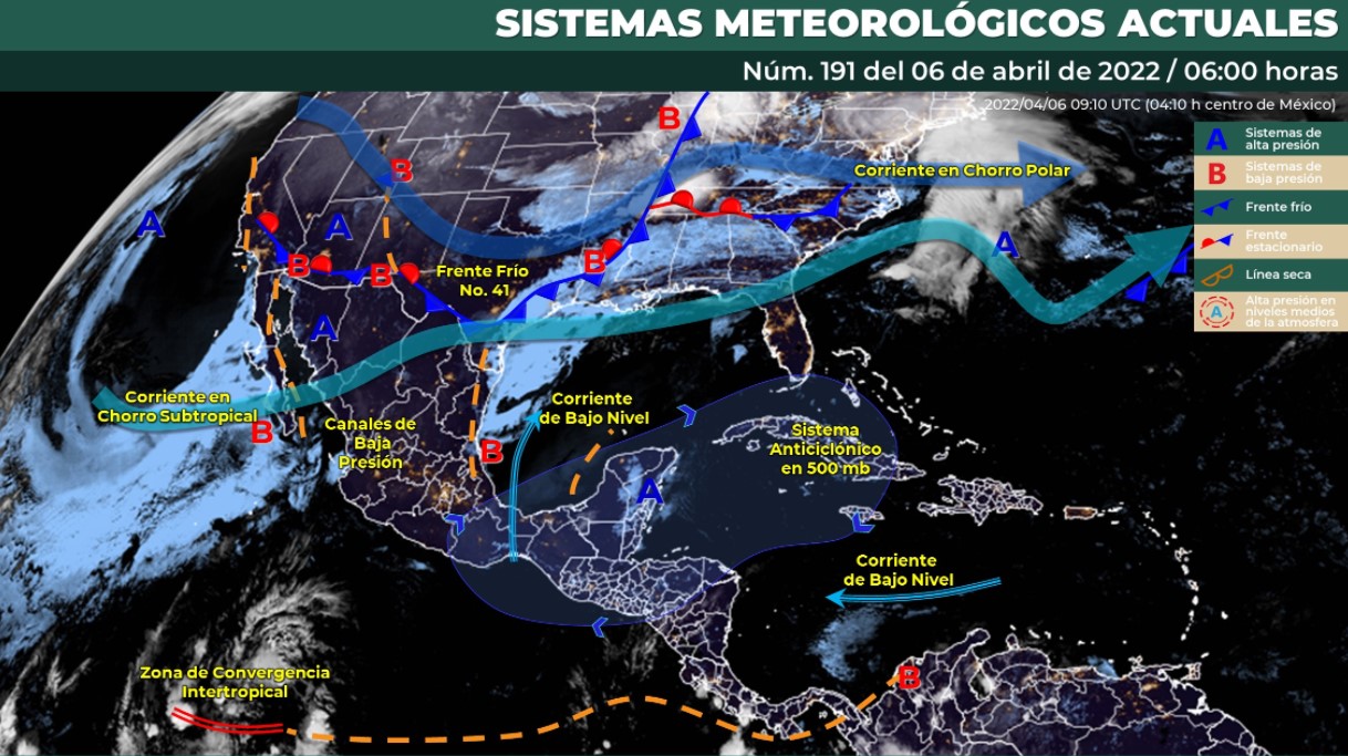 Les températures élevées se poursuivront dans tout le pays en raison de la vague de chaleur dominante. L'après-midi est prévu de chaud à très chaud, principalement dans les régions du nord-est, de l'est, du sud-est et de la péninsule du Yucatan. Dans le nord du pays, le 41e front froid devrait entrer avec la masse d'air froid qui lui est associée.