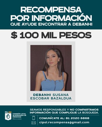 Une semaine après sa dernière visite, la Commission locale pour la recherche de personnes au Nuevo León a annoncé une récompense de 100 000 pesos pour des informations qui ont aidé à retrouver Debanhi Susana Escobar Bazaldua.