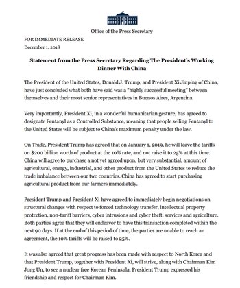 La Casa Blanca emitió un comunicado oficial en el que calificó como "altamente exitosa" y "productiva" la cena de trabajo que el presidente norteamericano Donald Trump y su par chino Xi Jinping mantuvieron este sábado en Buenos Aires, en el marco de la cumbre del G20.