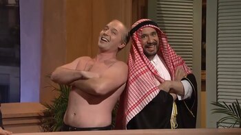 El presidente ruso también fue parodiado por su afectuoso saludo con el príncipe de Arabia Saudita, Mohamed bin Salman, -acusado de haber mandado a matar a un periodista- y por sus constantes muestras de masculinidad. De hecho aparece sin remera y exhibiendo sus músculos.