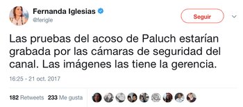 El viernes pasado se conoció que el periodista Ari Paluch fue denunciado por acoso sexual. Ariana Charrua, la denunciante, entregó una carta a las autoridades del canal A24 detallando la situación ocurrida la semana pasada. "Mi labor es quitarle los micrófonos y retornos a cada uno de los conductores. Me acerqué a retirar los equipos del señor Paluch, continuando con una de las panelistas. En ese instante, me tocó el trasero. Esta situación me resultó ingrata, sorpresiva, abusiva, ofensiva y desagradable", narró.