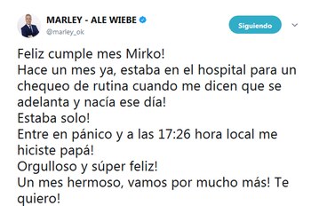 Y cuando cumplió el primer mes de vida, el conductor de The Wall lo saludó así desde Twitter: "¡Feliz cumplemes Mirko! ¡Hace un mes ya, estaba en el hospital para un chequeo de rutina cuando me dicen que se adelanta y nacía ese día! ¡Estaba solo! ¡Entré en pánico y a las 17:26 hora local me hiciste papá!".