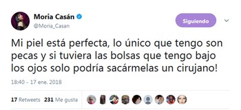 "Mi piel está perfecta, lo único que tengo son pecas y si tuviera las bolsas que tengo bajo los ojos ¡solo podría sacármelas un cirujano!", agregó en otro posteo.