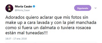 "Adorados quiero aclarar que mis fotos sin make up a cara lavada y con la piel manchada como si fuera un dalmata o tuviera rosacea están mal tuneadas!!!", arrancó su descargo Moria.