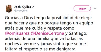 Por su parte, la protagonista de la polémica también hizo su descargo desde las redes sociales: "Gracias a Dios tengo la posibilidad de elegir que hacer y que no porque tengo un equipo atrás que me cuida y respeta como Omar Suárez, Denise Cerrone y Santiago, además de una familia que va todas las noches a verme y jamás sintió que se me faltara el respeto o se me denigrara", escribió.