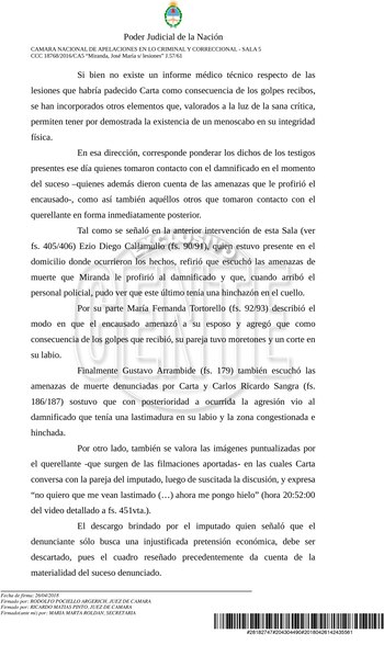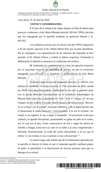 LA CAUSA: todo ocurrió el 17 de diciembre de 2015 a las 20 horas, aproximadamente. La carátula reza: "Miranda, José María s/lesiones leves y amenazas". En los considerandos de la causa se le atribuye presentarse "con su pareja Mercedes Sarrabayrouse en el consultorio de Marcelo Julio Carta sito en Riobamba…, de esta Ciudad y decirle a María Fernanda Tortello (esposa del denunciante): 'Marcelo no va a llegar con el trabajo', haciendo referencia a los arreglos bucales que le estaba haciendo a ella. 'Me estafó, es un cagador, lo voy a cagar a trompadas'".