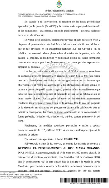 EXCLUSIVO: LA RESOLUCIÓN DE LA CÁMARA NACIONAL DE APELACIONES.