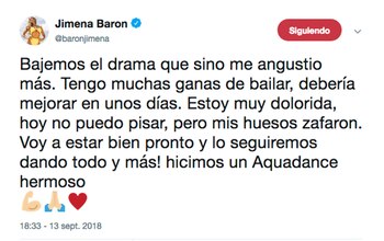 "Bajemos el drama que sino me angustio más. Tengo muchas ganas de bailar, debería mejorar en unos días. Estoy muy dolorida, hoy no puedo pisar, pero mis huesos zafaron. Voy a estar bien pronto y lo seguiremos dando todo y más! hicimos un aquadance hermoso", explicó.