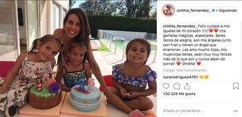 En otro posteo, posó con sus hijas y les declaró todo su amor. "Feliz cumple a mis iguales de mi corazón !!!!!!❤️❤️ mis gemelas mágicas, especiales. Seres llenos de alegría, son mis ángeles junto con Fran y tienen un ángel que enamoran. Las amo mucho hijas, mis mujercitas bellas, sean muy muy felices más de lo que son y nunca dejen de sonreír ❤️ OHANA ❤️", confesó.