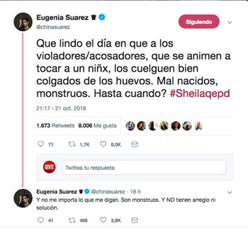 "Qué lindo el día en que a los violadores o acosadores, que se animen a tocar a un niñx, los cuelguen bien colgados de los huevos. Mal nacidos, monstruos. ¿Hasta cuándo? #Sheilaqepd", fue su primer tuit.