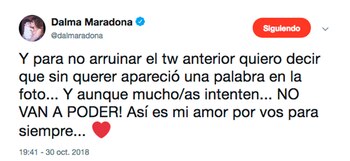 "Y para no arruinar el tweet anterior quiero decir que sin querer apareció una palabra en la foto… Y aunque mucho y muchas lo intenten… ¡NO VAN A PODER! Así es mi amor por vos, (invencible), para siempre…", escribió.
