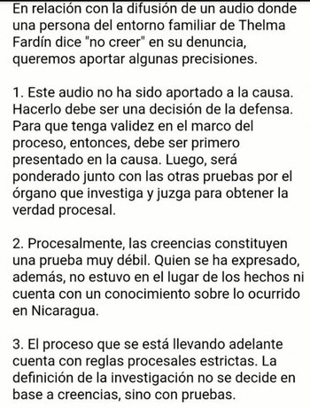 "El equipo que lleva adelante la denuncia cuenta tanto con prueba testimonial como pericial, que confirman lo que ha denunciado Thelma. Hemos tomado la decisión de llevar esos testimonios a la Justicia para que sean asentados en el lugar correspondiente".