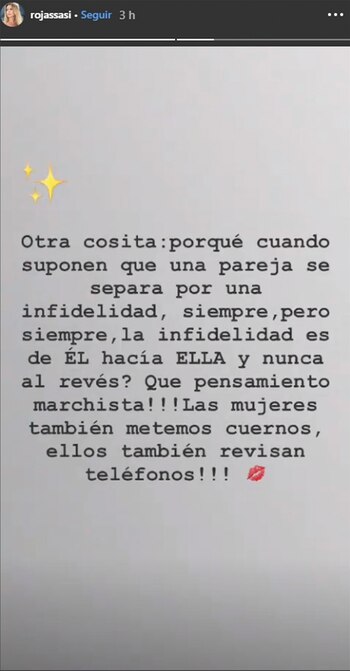 "Otra cosita. ¿Por qué cuando suponen que una pareja se separa por una infidelidad, siempre -pero siempre- la infidelidad es de él hacia ella y nunca al revés? ¡¡¡Qué pensamiento machista!!! Las mujeres también metemos cuernos, ellos también revisan teléfonos", escribió.