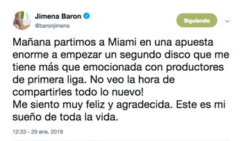 Un día antes del viaje Jimena compartió con sus seguidores de Twitter lo que significa para ella esta oportunidad: "Mañana partimos a Miami. En una apuesta enorme, a empezar un segundo disco que me tiene más que emocionada, con productores de primera liga. ¡No veo la hora de compartirles todo lo nuevo! Me siento muy feliz y agradecida. Este es mi sueño de toda la vida", escribió.