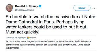 "Es tan horrible ver el enorme incendio en la catedral de Notre Dame en París. Tal vez se puedan usar aviones cisterna para apagarlo. ¡Debe actuarse rápidamente!", tuiteó Donald Trump.