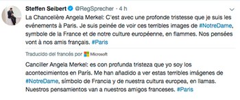 "Estas horribles imágenes de Notre Dame en llamas duelen. Notre Dame es un símbolo de Francia y de nuestra cultura europea. Nuestros pensamientos están con los amigos franceses", tuiteó el portavoz de Merkel, Steffen Seibert.