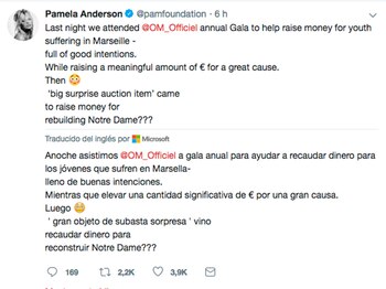Sin responder directamente a Pamela Anderson, el Olímpico de Marsella dijo en un comunicado el miércoles que la suma total recaudada el martes por la noche fue de 439.760 euros.