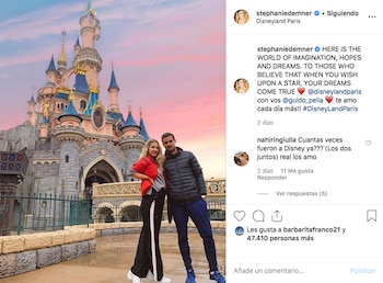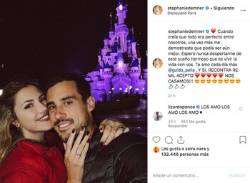 "Cuando creía que todo era perfecto entre nosotros, una vez más me demostraste que podía ser aún mejor. Espero nunca despertarme de este sueño hermoso que es vivir la vida con vos. Te amo cada día más @guido_pella. Y si, recontra re mil acepto… ¡Nos casamos!", escribió la modelo en su cuenta de Instagram junto a una foto abrazándose con el significativo castillo de Disneyland París de fondo.