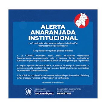 La CODRED del departamento de Sacatepéquez mantiene vigente la alerta anaranjada departamental, lo que implica el apresto permanente de todo el personal de instituciones públicas ante cualquier contingencia derivada de la actividad volcánica.