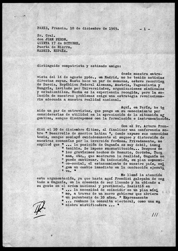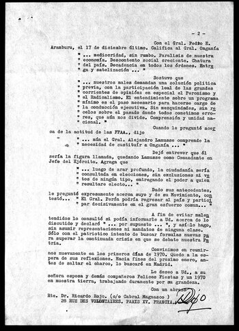 Al fin de evitar malentendidos lo consulté si podía informarle a usted acerca de lo discutido y declaró "por supuesto" y así lo hago sin asumir representaciones ni mandatos de ninguna clase. Sólo con el patriótico intento de encontrar fórmulas nuevas para superar la continuada crisis en que se debate nuestra Patria. Convinimos en reunirnos nuevamente en los primeros días de 1970. Quedo a la espera de sus reflexiones. Hacia fines de enero lo buscaré en Madrid.