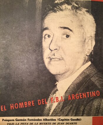 Cuando Perón fue derrocado el 16 de septiembre de 1955, la Policía llevó adelante tres investigaciones: un proceso sobre torturas, la desaparición de un niño en las aguas del Tigre y la muerte de Juan Duarte. Le cupo esta tarea a Próspero Germán Fernández Albariños, también conocido como "Capitán Gandhi", de profesión maestro de escuela, que había cursado hasta tercer año de Medicina en la universidad, que trabajaba en la Policía Federal y que no habría estado en su sano juicio. La prensa anti peronista lo definía, exageradamente, como "el hombre del F.B.I. Argentino". A Gandhi lo desvela probar que Perón había mandado a matar a su cuñado.
