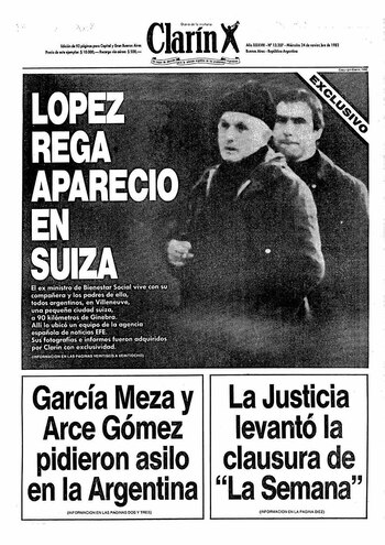 Será en noviembre de 1982. Manuel Agustín Díaz monta guardia y consigue la foto del hombre más buscado de la Argentina. La foto de un López Rega envejecido fue tapa de Clarín el 24 de noviembre de 1982. El cerco se empezaba a estrechar y abandonó el poblado cercano a Ginebra, donde vivía con Cisneros y los padres de ella.